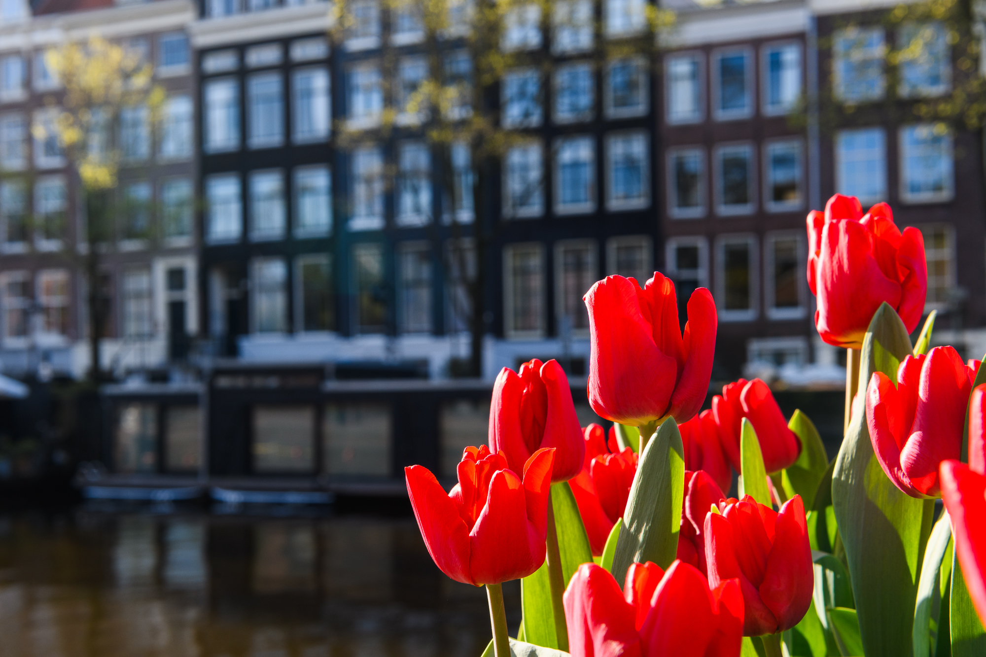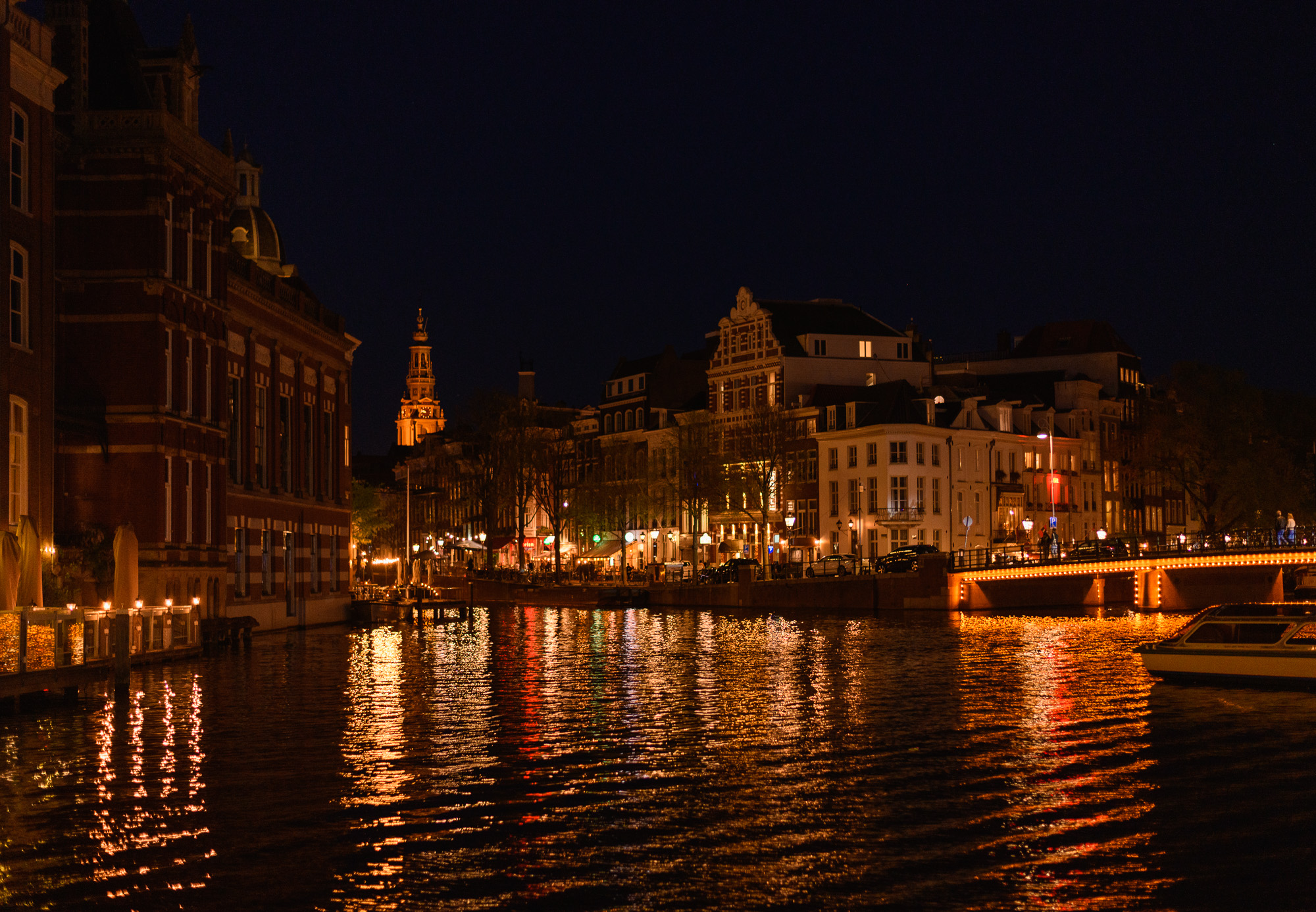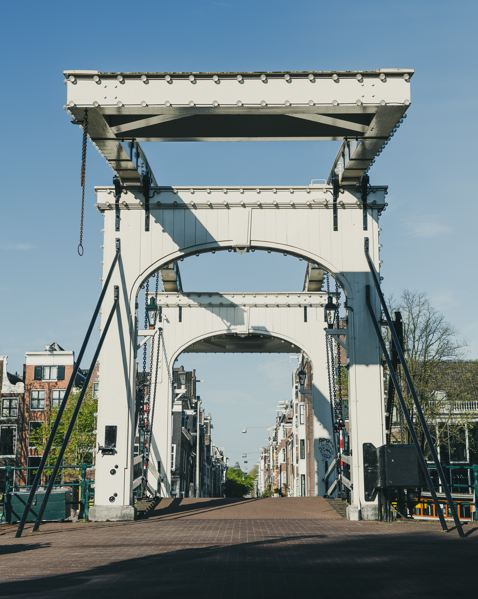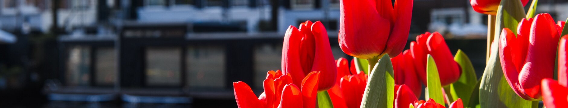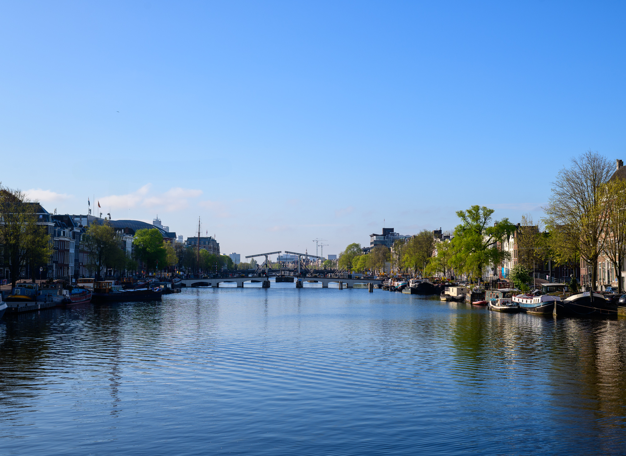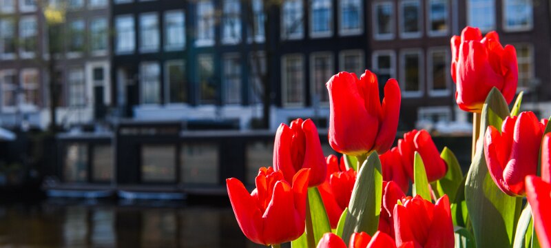 Blue ExpanseDaytime view down the Amstel River toward the Magere Brug with moored boats along both banks. Canal FlowersBright red tulips bloom beside traditional canal houses in Amsterdam during spring. Teal PanelsCopper-clad slope of the NEMO Science Museum in Amsterdam with city street reflections. Curved CopperClose-up of the curved copper exterior of the NEMO Science Museum in Amsterdam. Riverside CurveCalm Amsterdam canal bend framed by leafy trees and mixed historic-modern buildings mirrored in the water. White ArchesFront-on view of the white wooden Magere Brug drawbridge spanning a quiet street in Amsterdam. Vertical GiantTall modern office tower rises against a clear blue Amsterdam sky. Window RepetitionDiagonal view of a modern Amsterdam facade with staggered box windows. Canal GlowNight view of canal houses reflecting lights on the Amstel River in Amsterdam. WienKøbenhavn