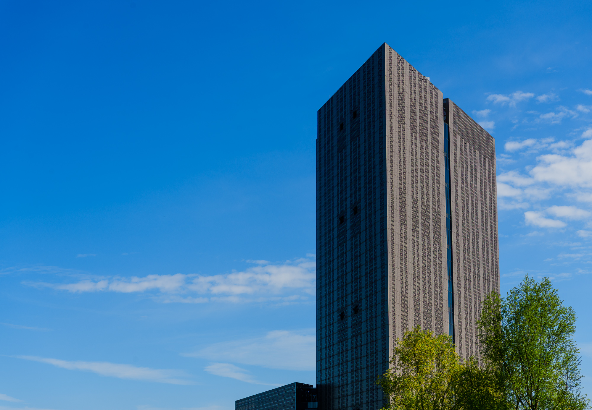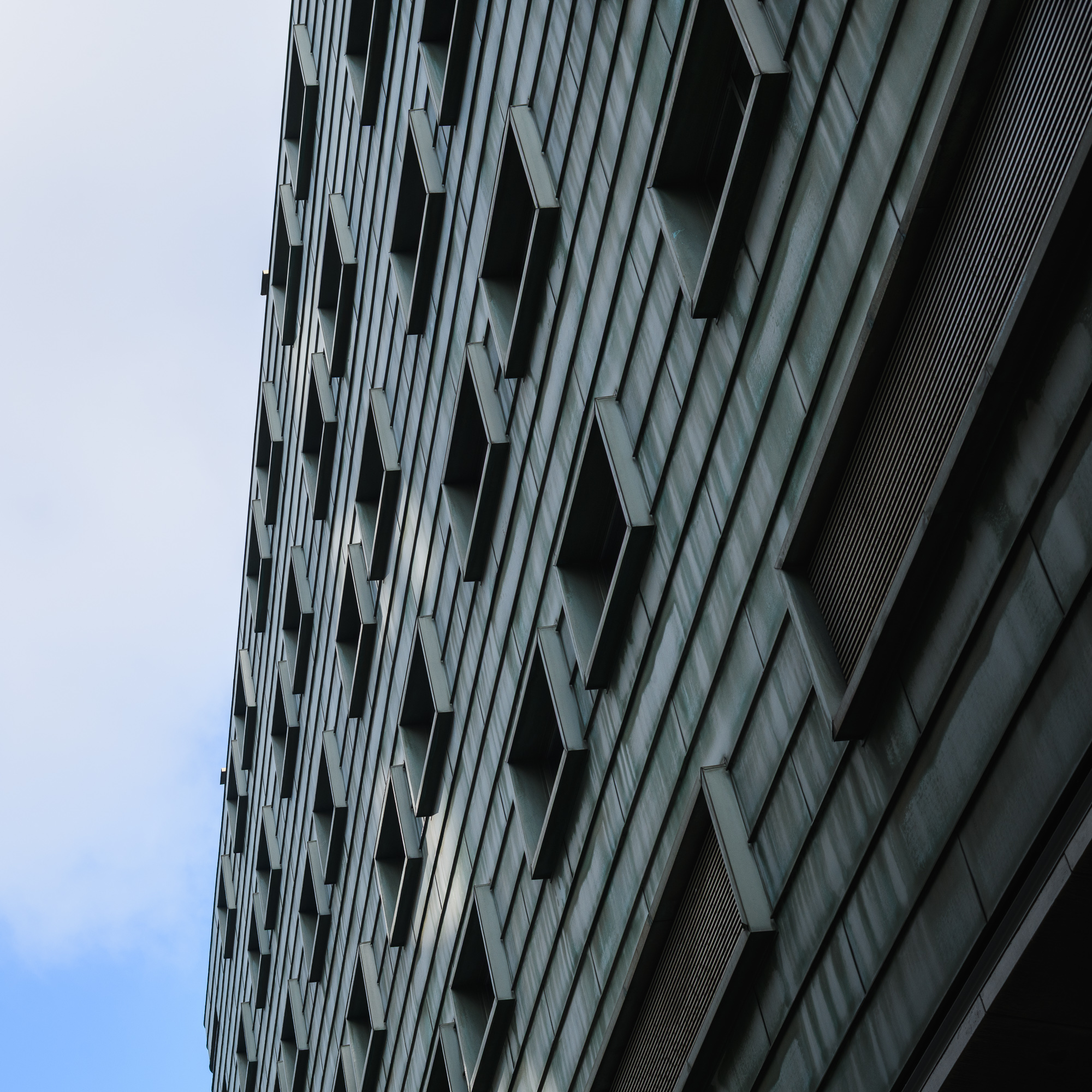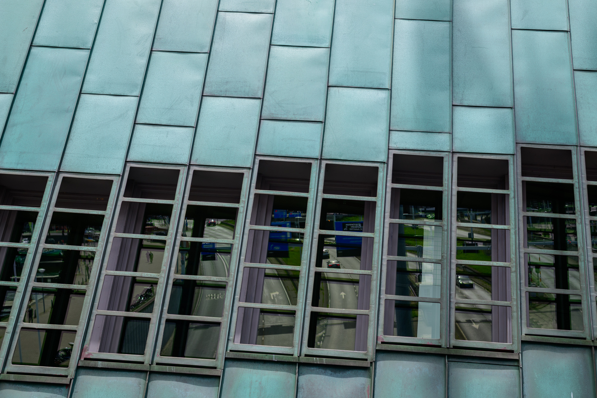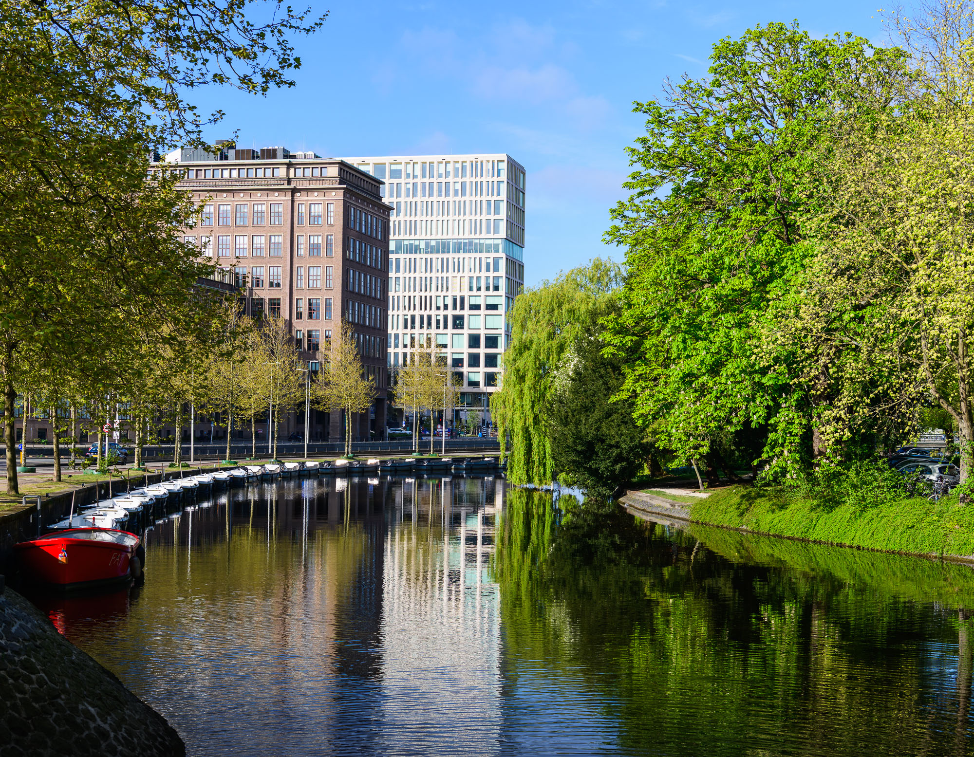 Blue ExpanseDaytime view down the Amstel River toward the Magere Brug with moored boats along both banks. Canal FlowersBright red tulips bloom beside traditional canal houses in Amsterdam during spring. Teal PanelsCopper-clad slope of the NEMO Science Museum in Amsterdam with city street reflections. Curved CopperClose-up of the curved copper exterior of the NEMO Science Museum in Amsterdam. Riverside CurveCalm Amsterdam canal bend framed by leafy trees and mixed historic-modern buildings mirrored in the water. White ArchesFront-on view of the white wooden Magere Brug drawbridge spanning a quiet street in Amsterdam. Vertical GiantTall modern office tower rises against a clear blue Amsterdam sky. Window RepetitionDiagonal view of a modern Amsterdam facade with staggered box windows. Canal GlowNight view of canal houses reflecting lights on the Amstel River in Amsterdam. WienKøbenhavn