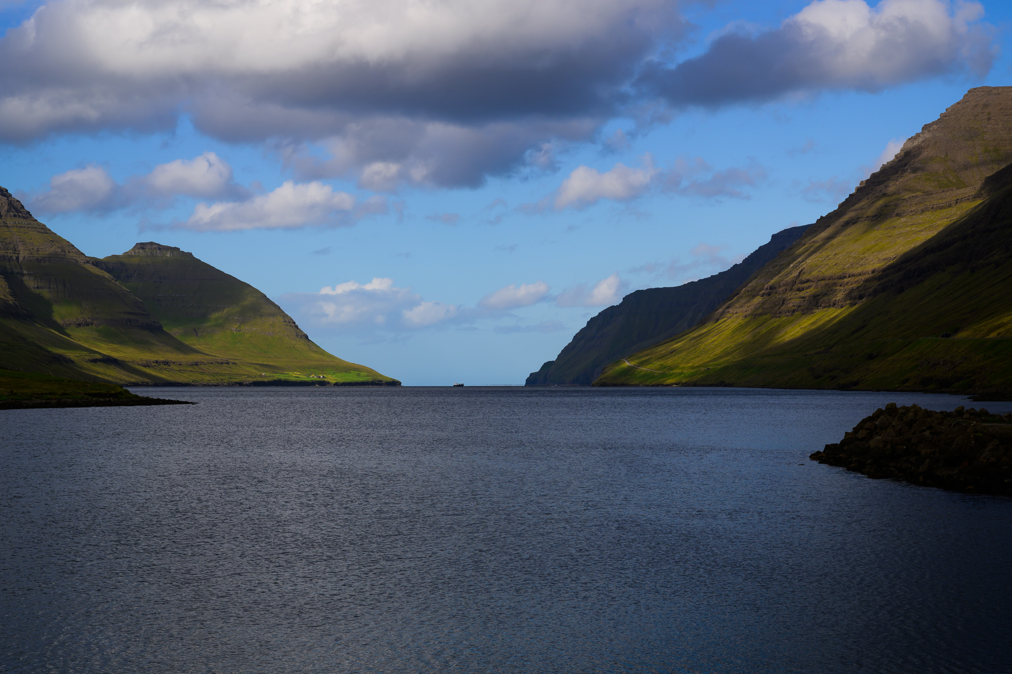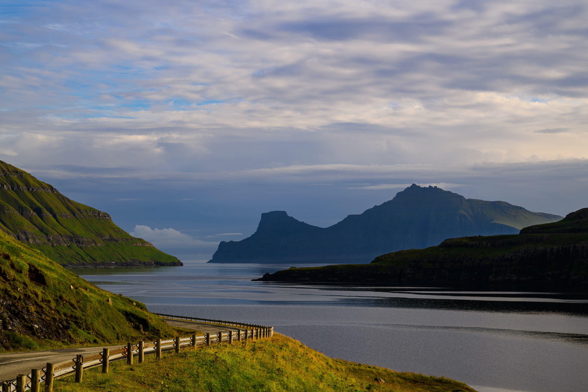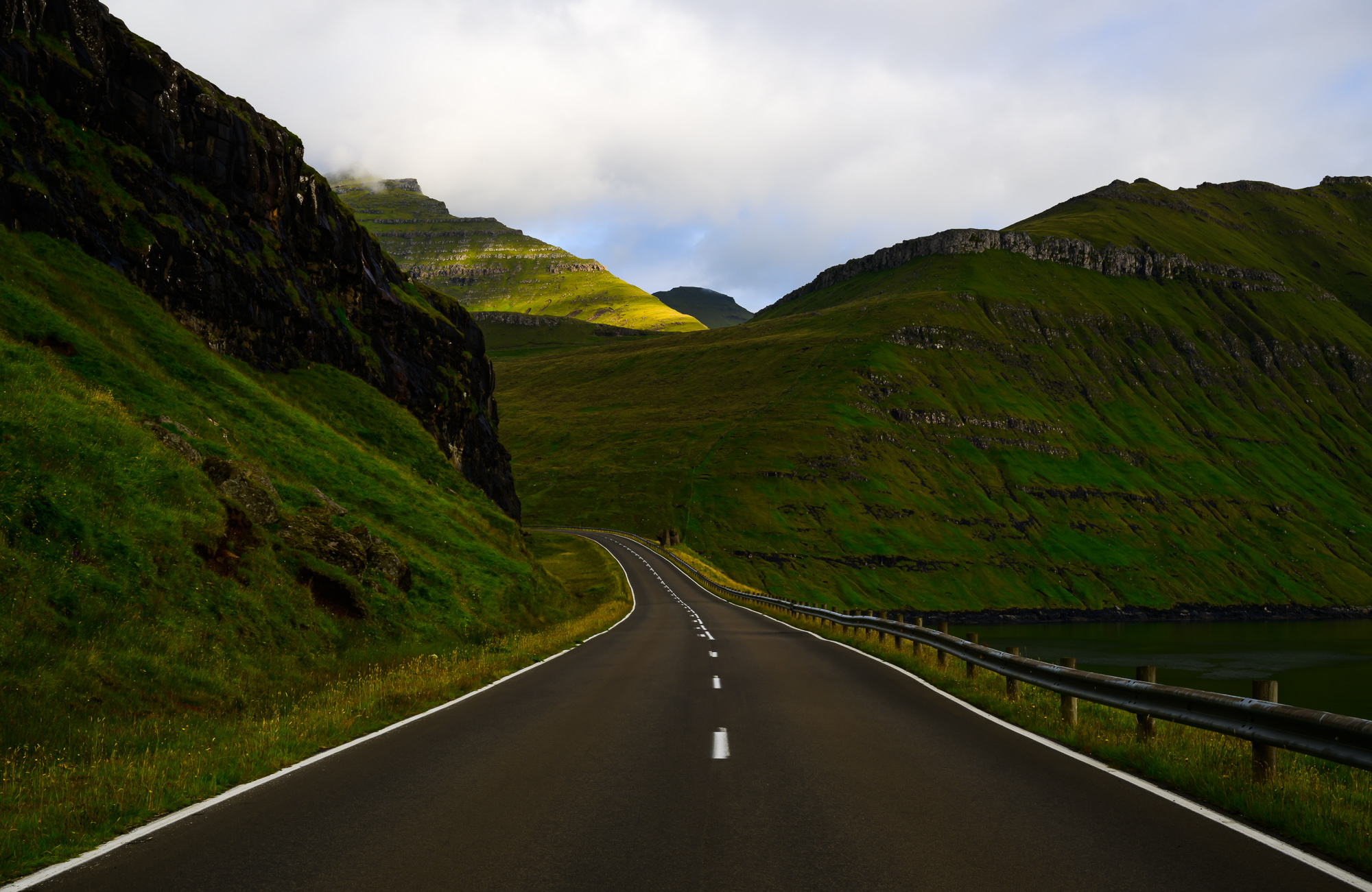 Winding road leading through green mountains under drifting clouds in the Faroe Islands.