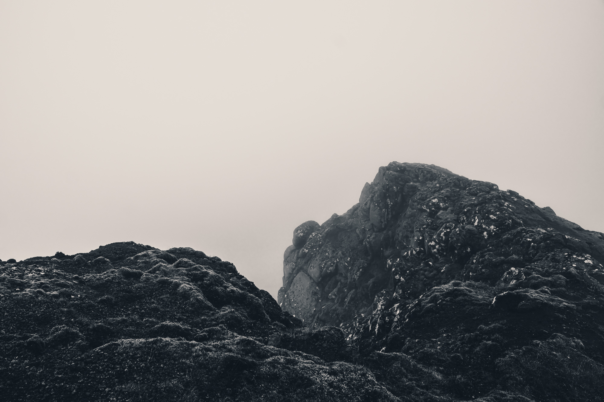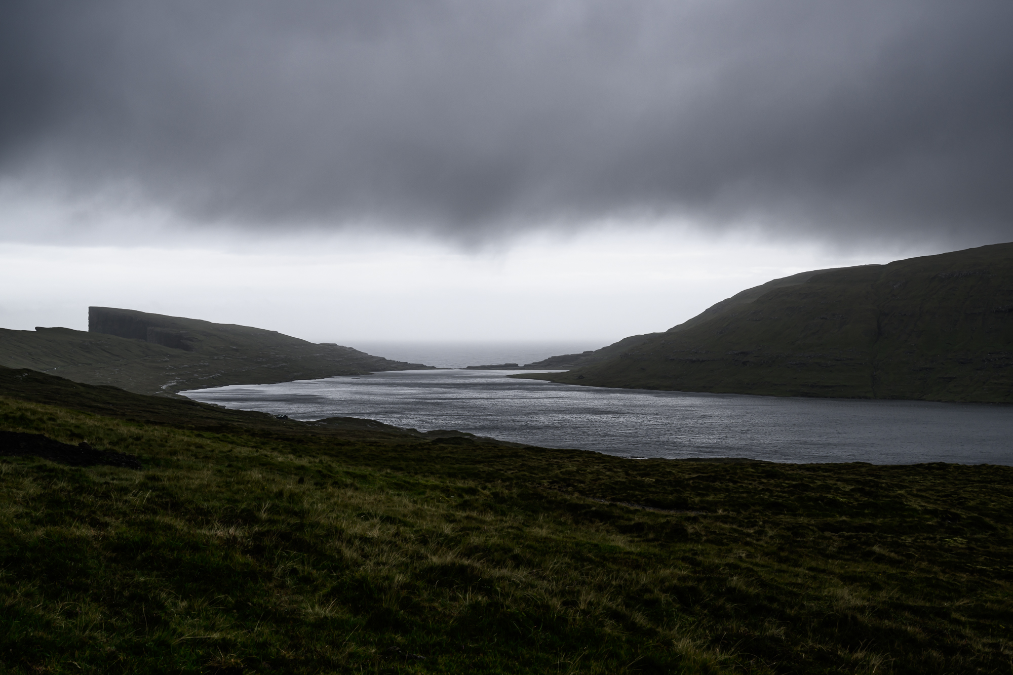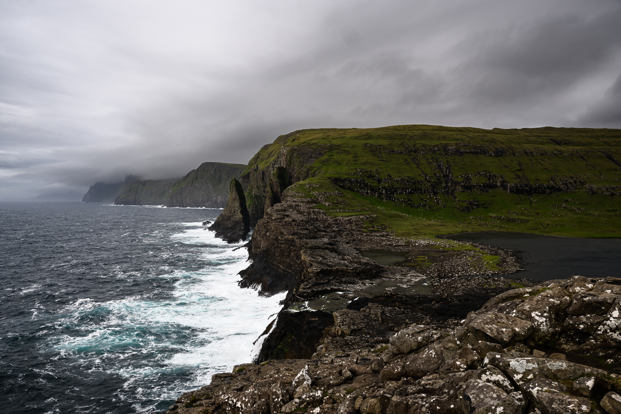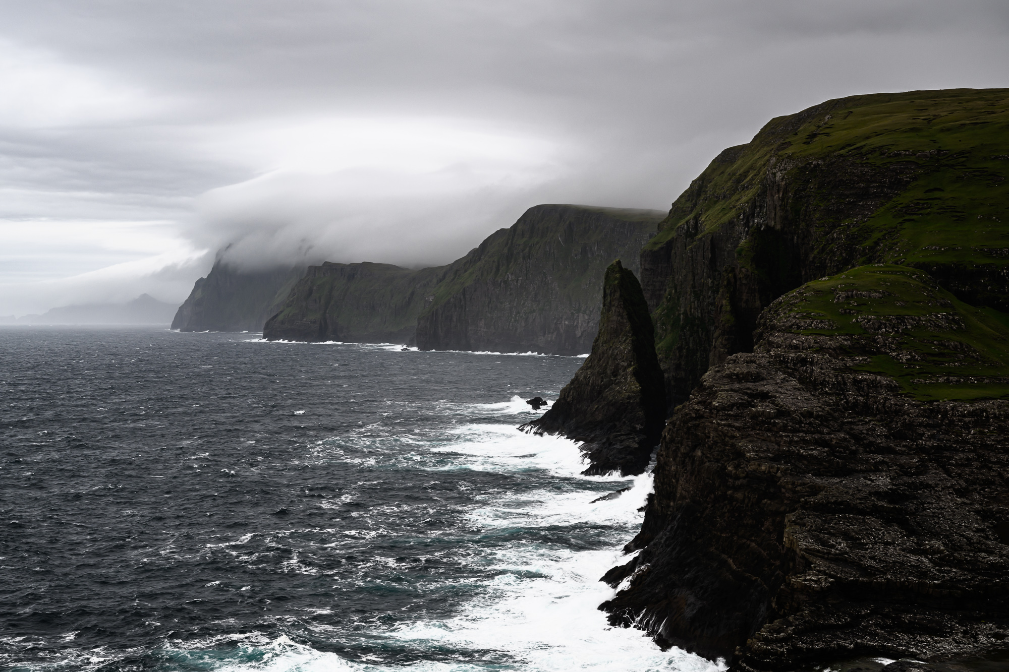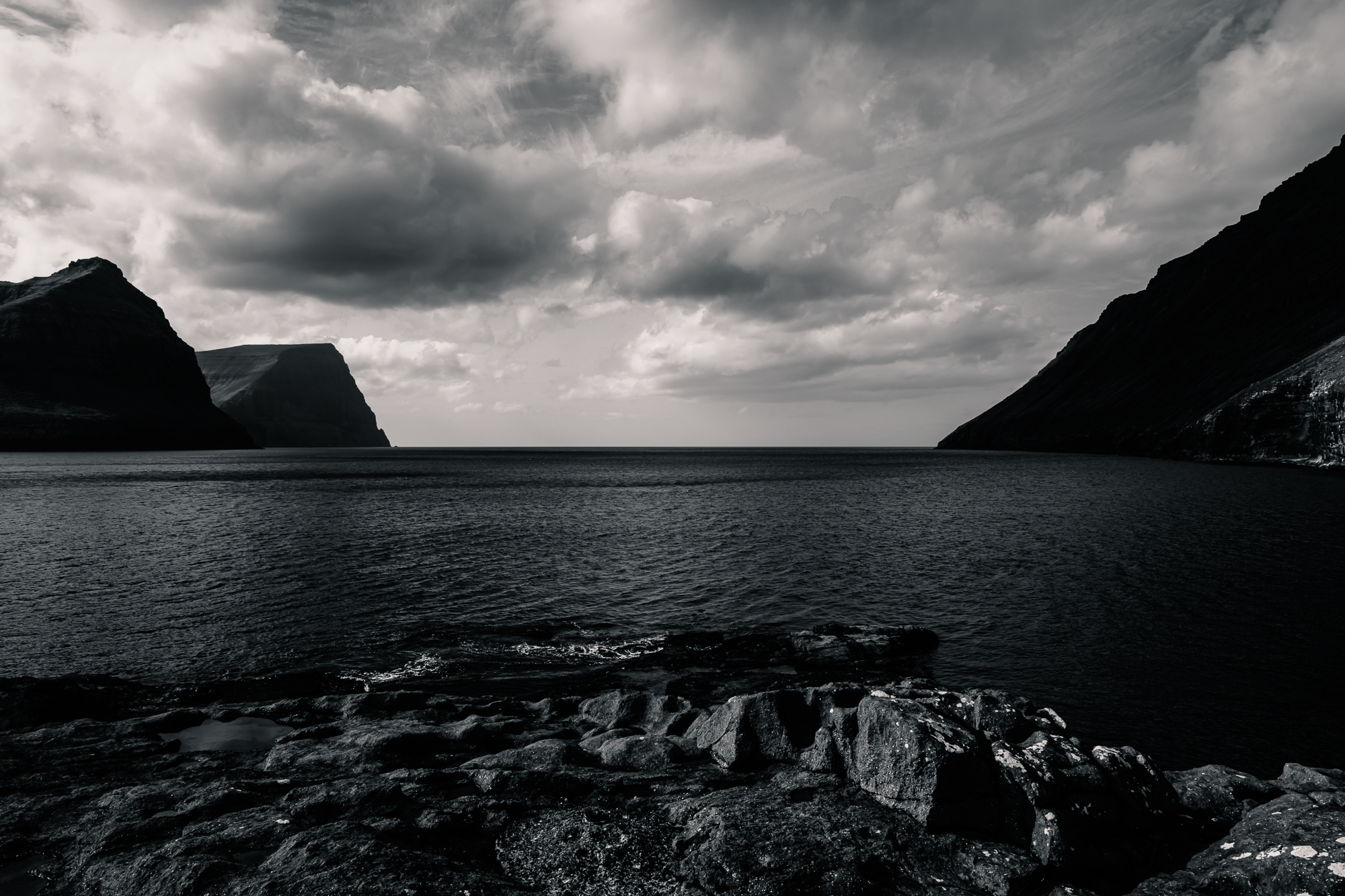 Black and white view of the cliffs at Trælanípa with distant islands under heavy clouds in the Faroe Islands.