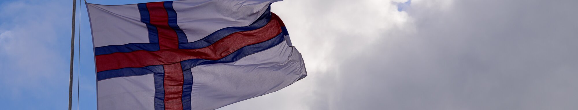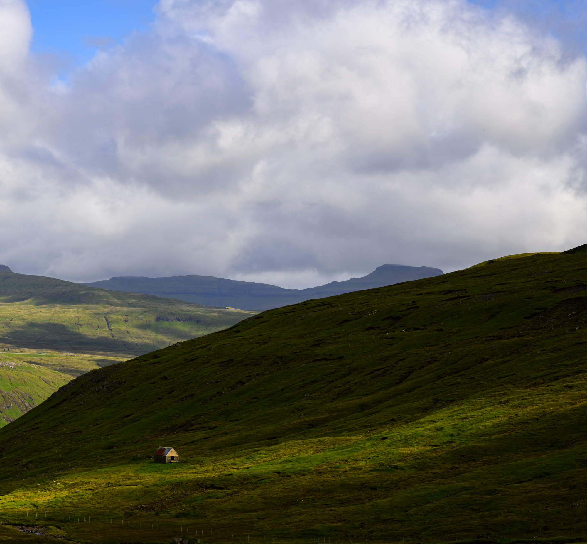 Viðareiði Church set against a steep mountain under dramatic skies in the Faroe Islands.