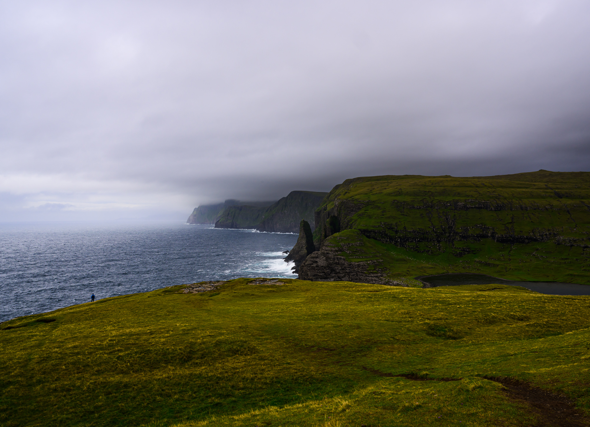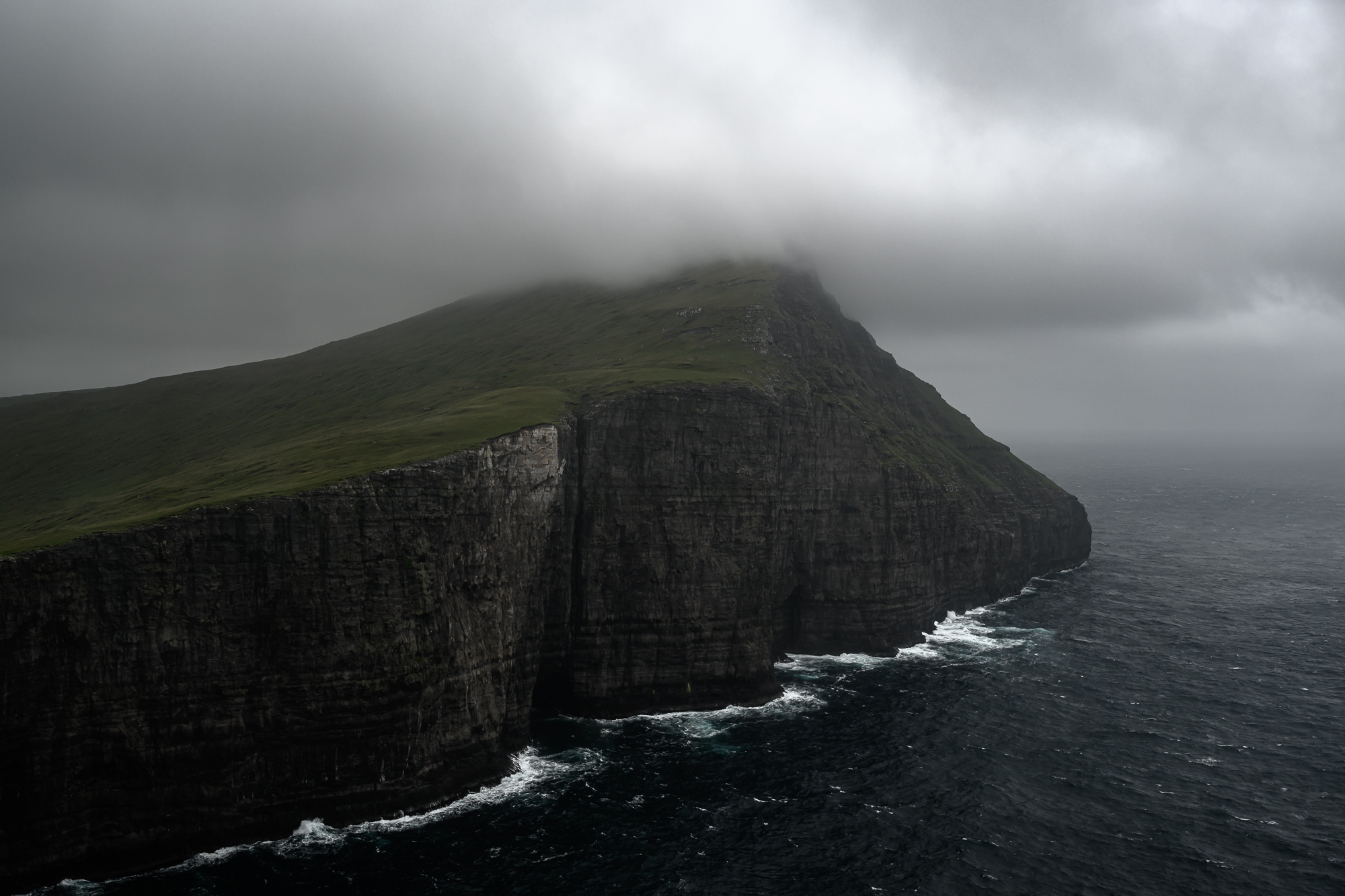 Cliffside at Trælanípa overlooking the Atlantic Ocean under soft light in the Faroe Islands.