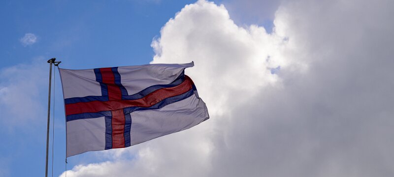 Cliffs and rocky shore with scattered houses overlooking the sea in the Faroe Islands.