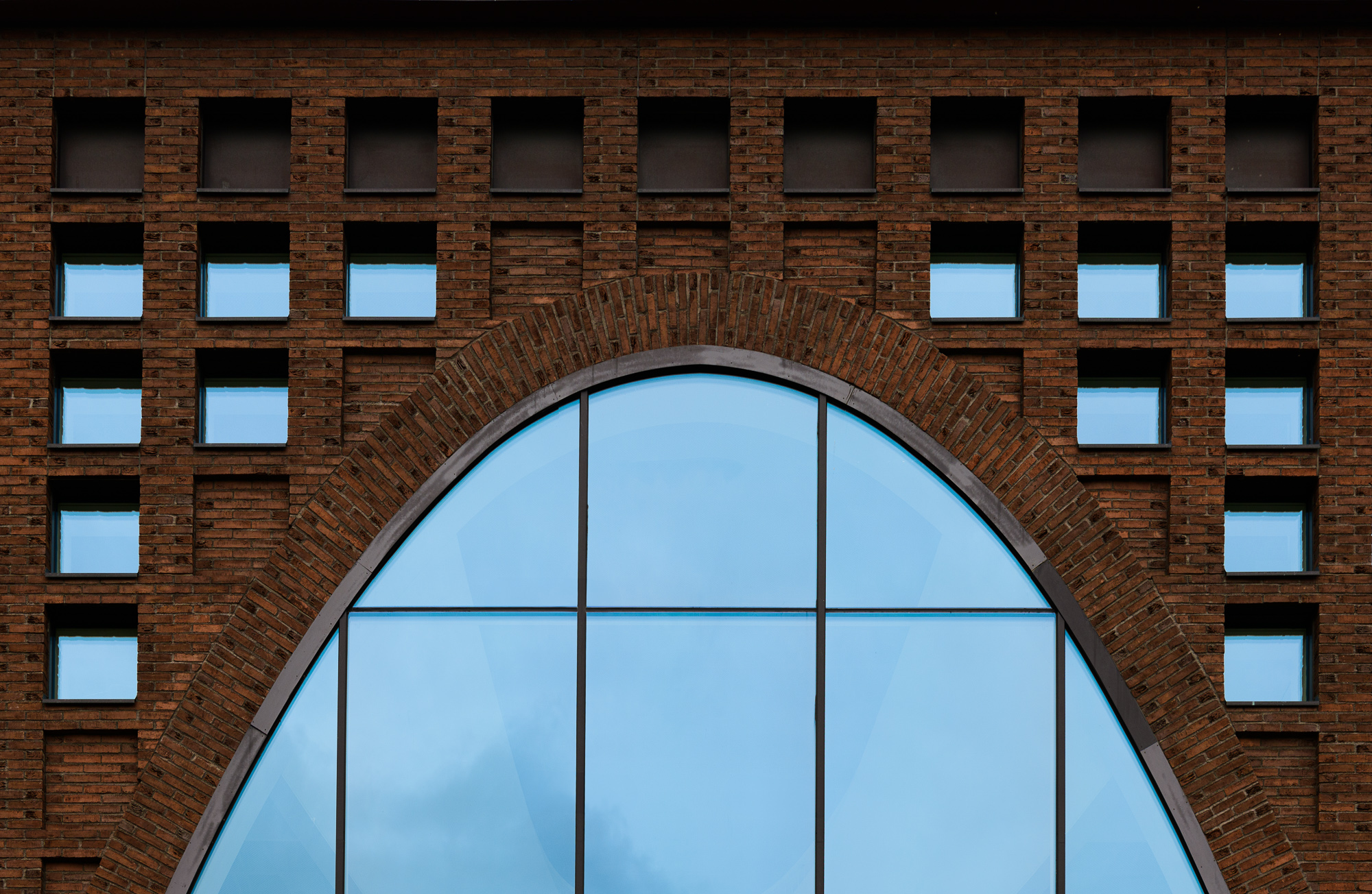 Brick façade with arched glass opening and regular square windows at Helsinki University’s Kaisa House library building.