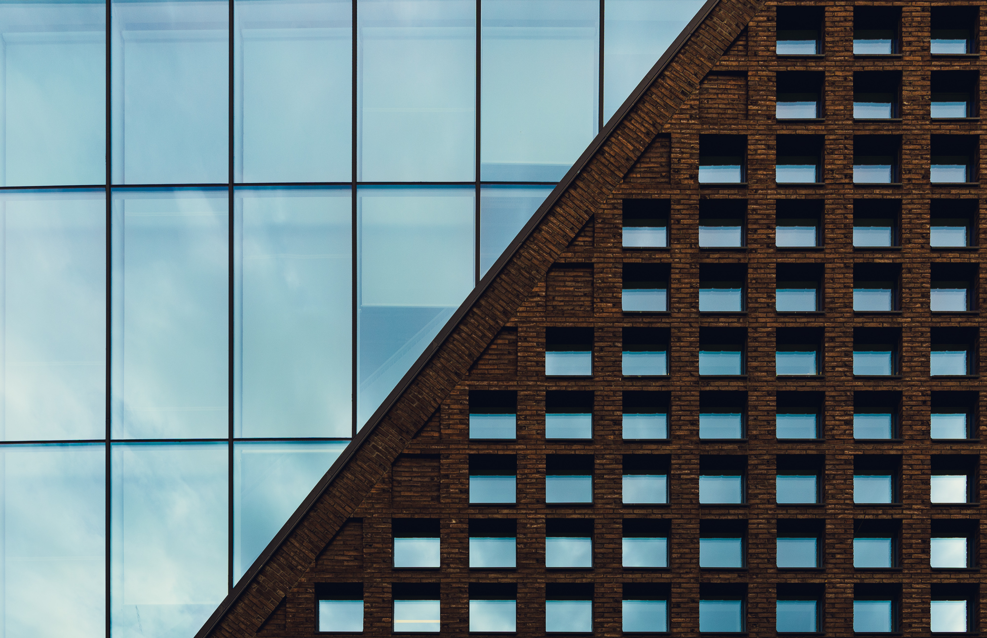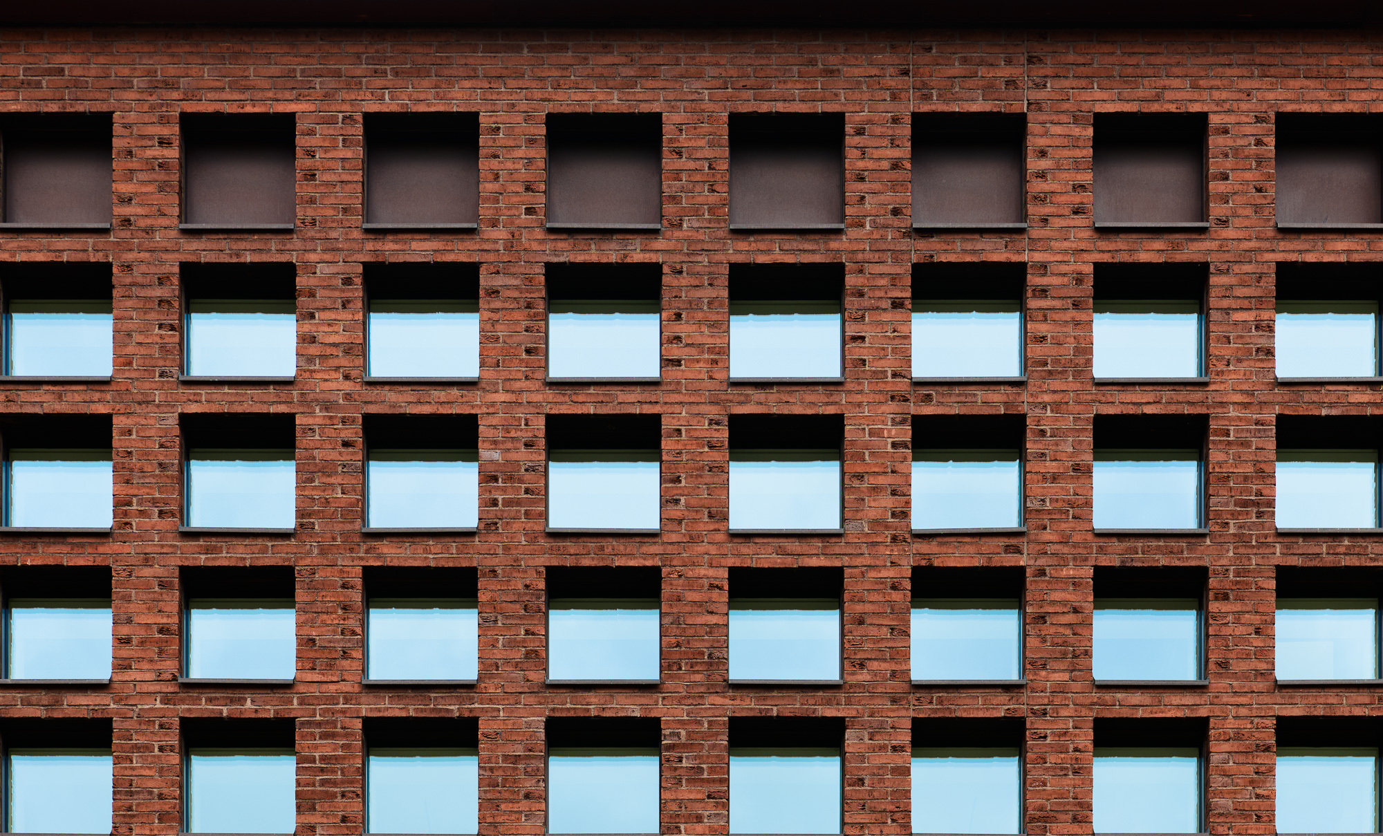 Grid of square windows in red-brick façade at Helsinki University’s Kaisa House library.