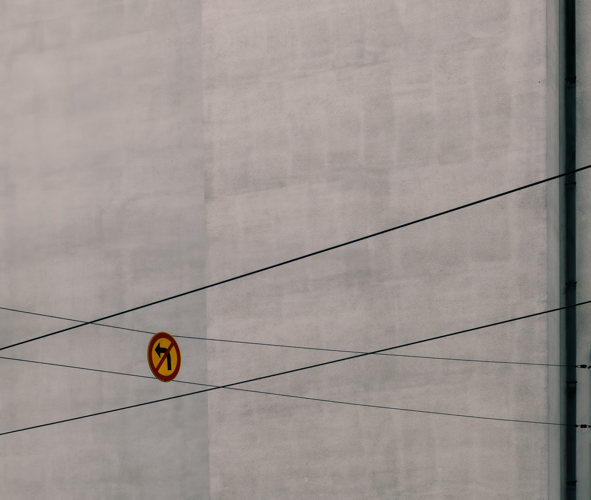 Circular traffic sign indicating no left turn suspended on overhead wires against a plain building wall in Helsinki.