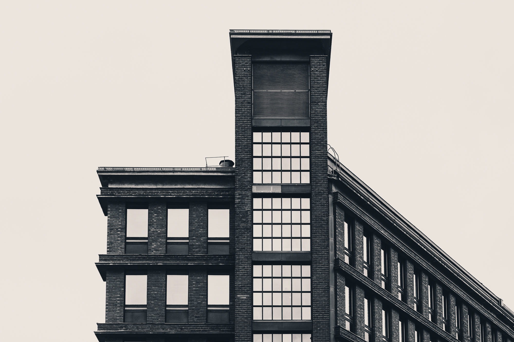Black and white photo of the triangular red brick K13 building on Kaisaniemenkatu in Helsinki.