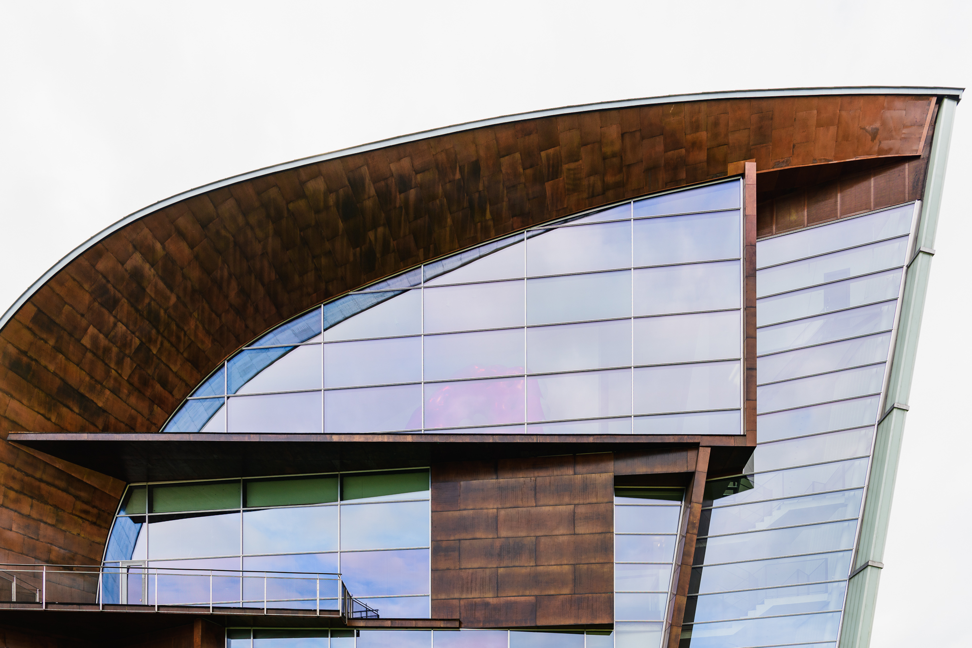 Curved glass and metal façade of Kiasma Museum of Contemporary Art near Helsinki Central Station.