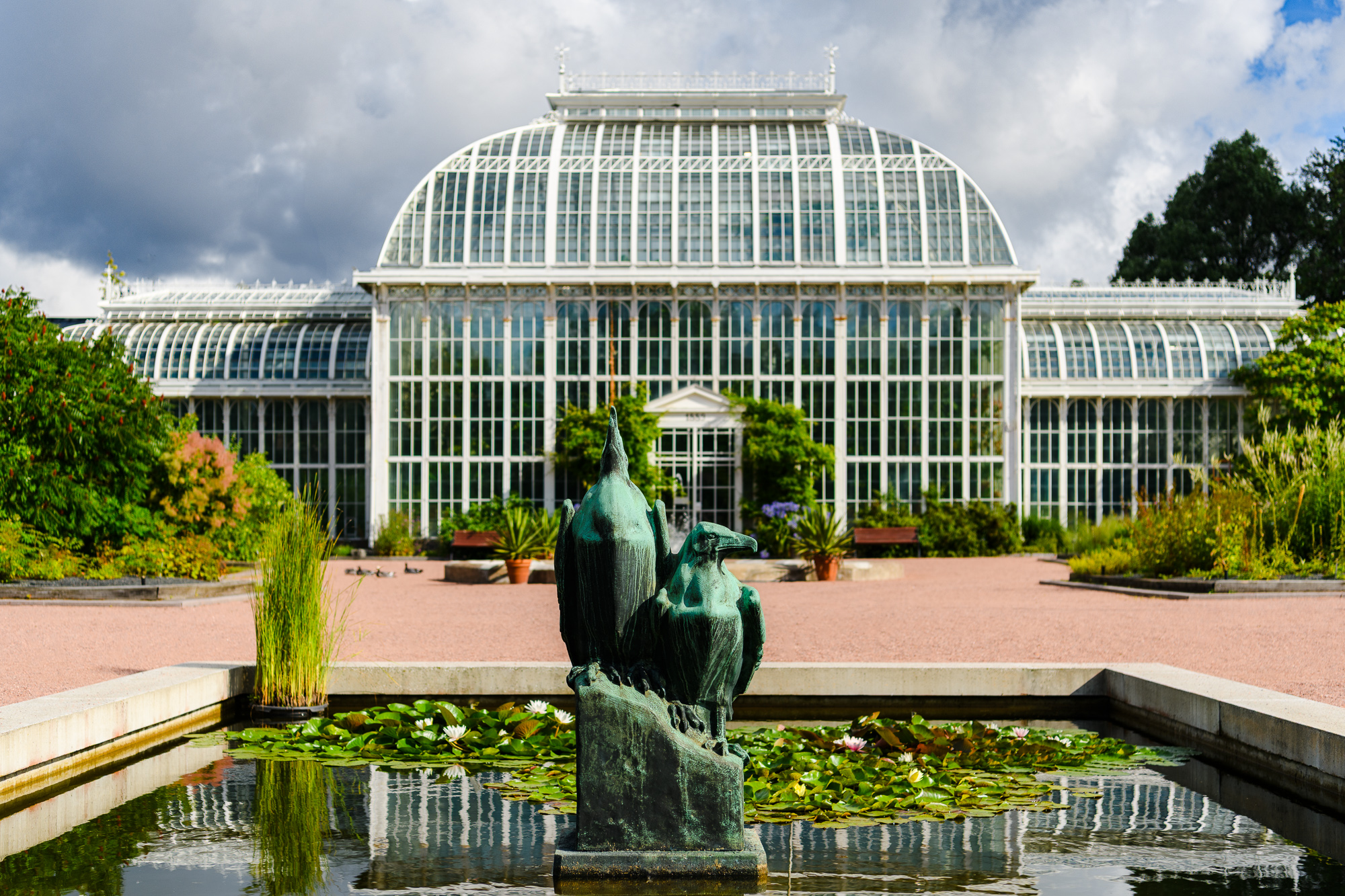 Palm House glass greenhouse with bird sculpture and lily pond in Kaisaniemi Botanic Garden, Helsinki.