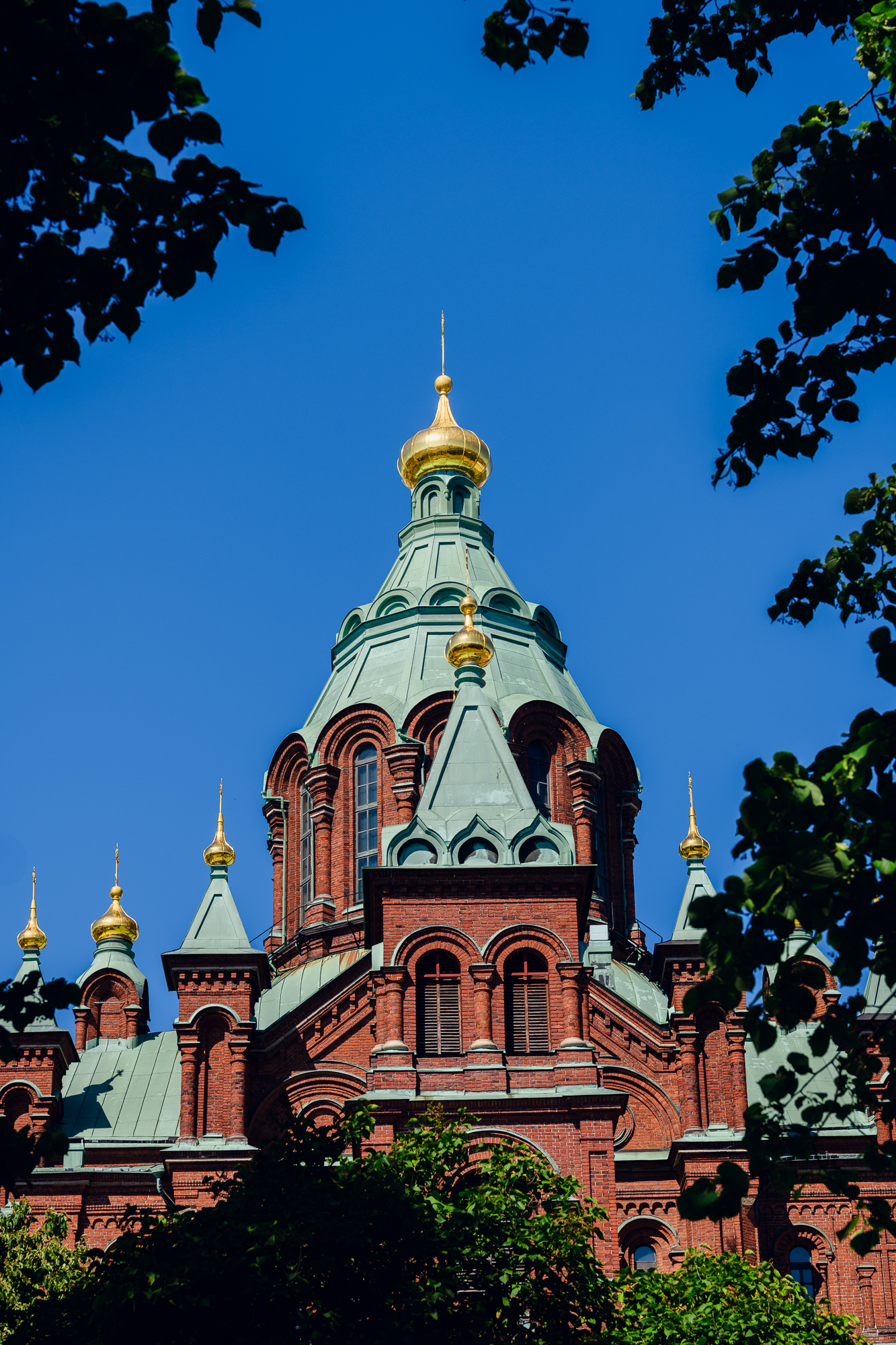Uspenski Cathedral, a red brick Orthodox church with green roofs and golden domes, framed by leafy branches in Helsinki.