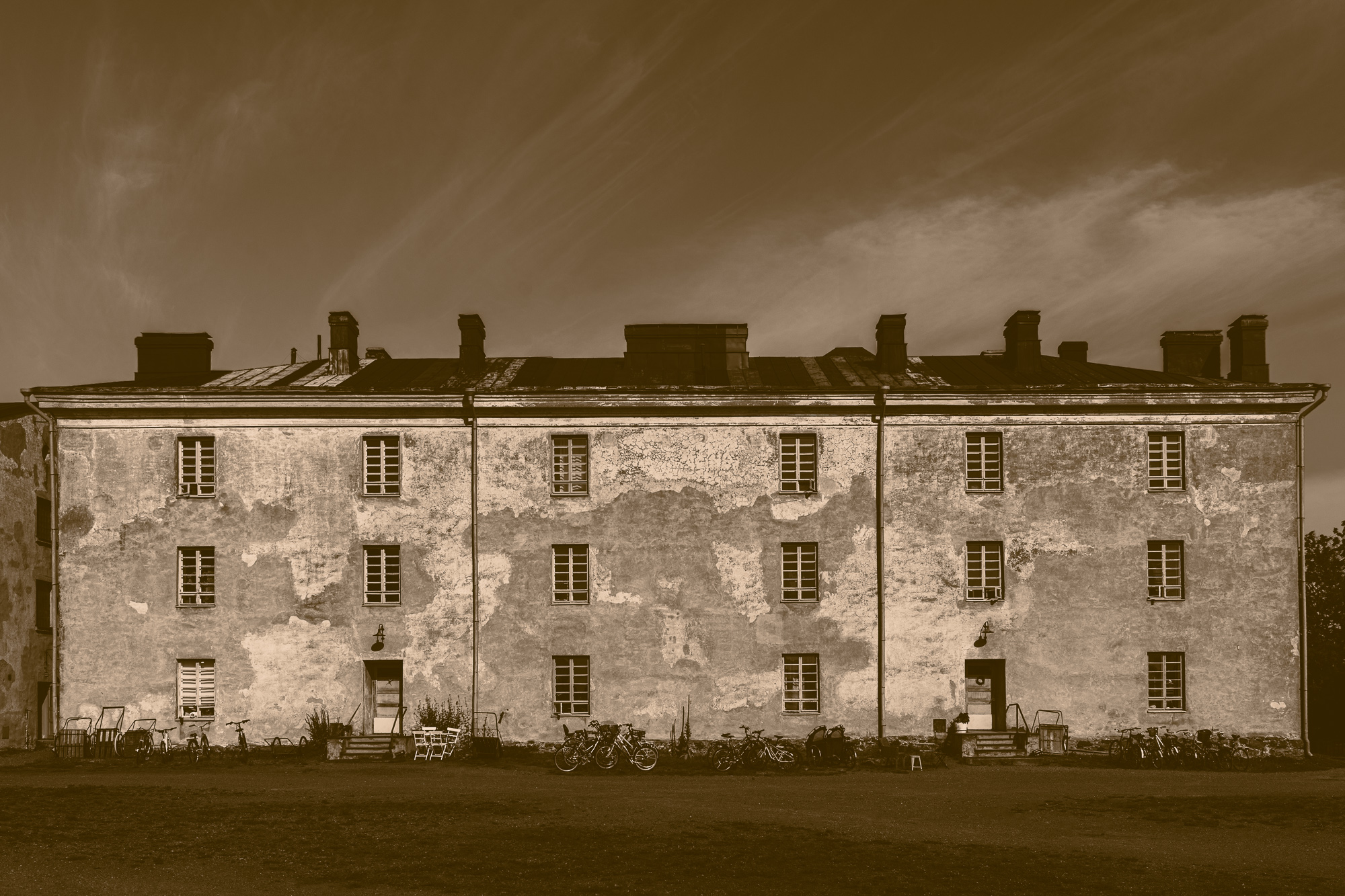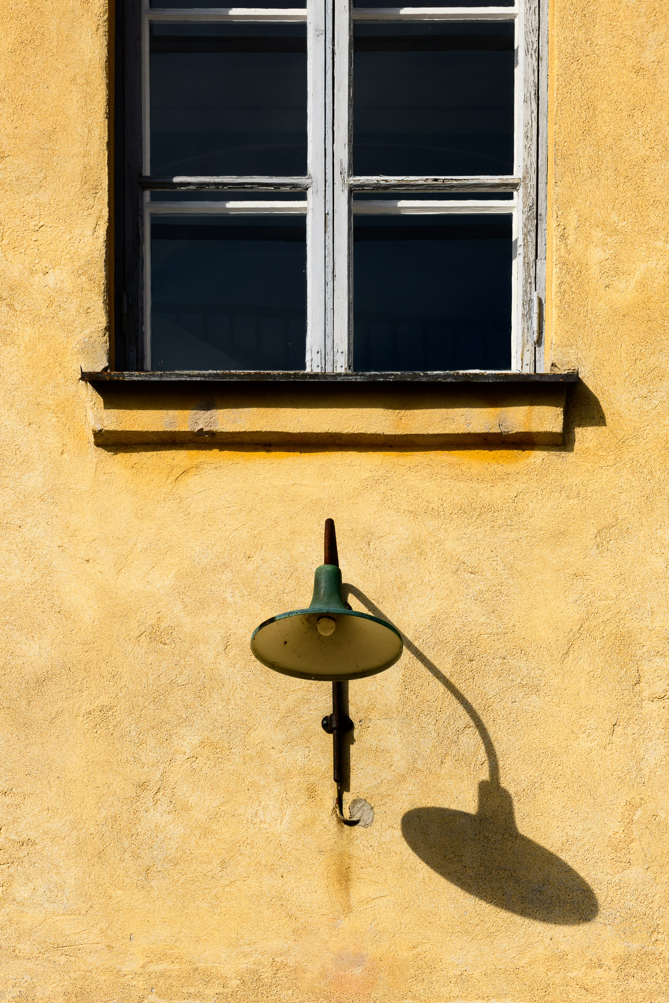 A weathered yellow wall with an old lamp and a wooden-framed window on Länsi-Mustasaari Island in the Suomenlinna district of Helsinki.