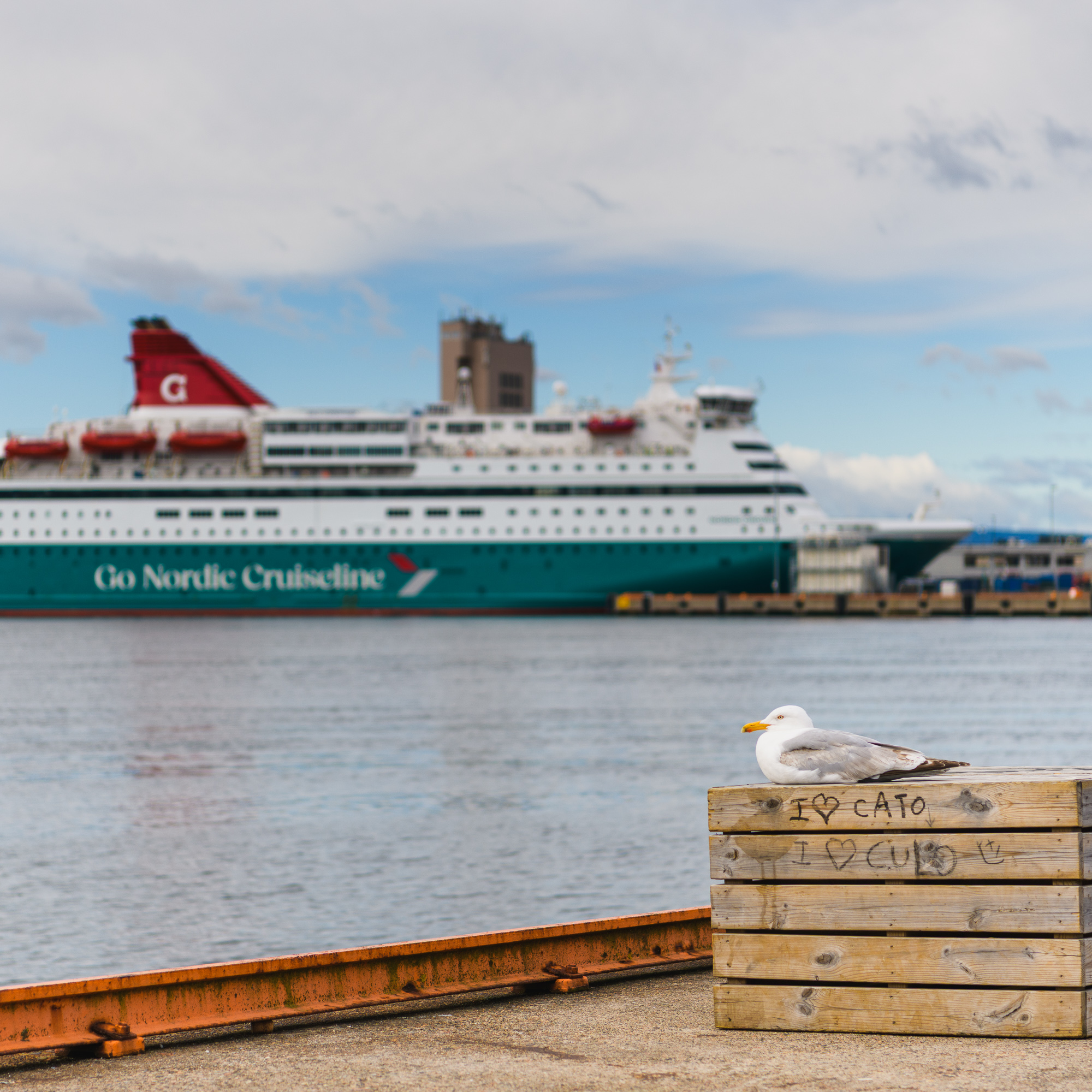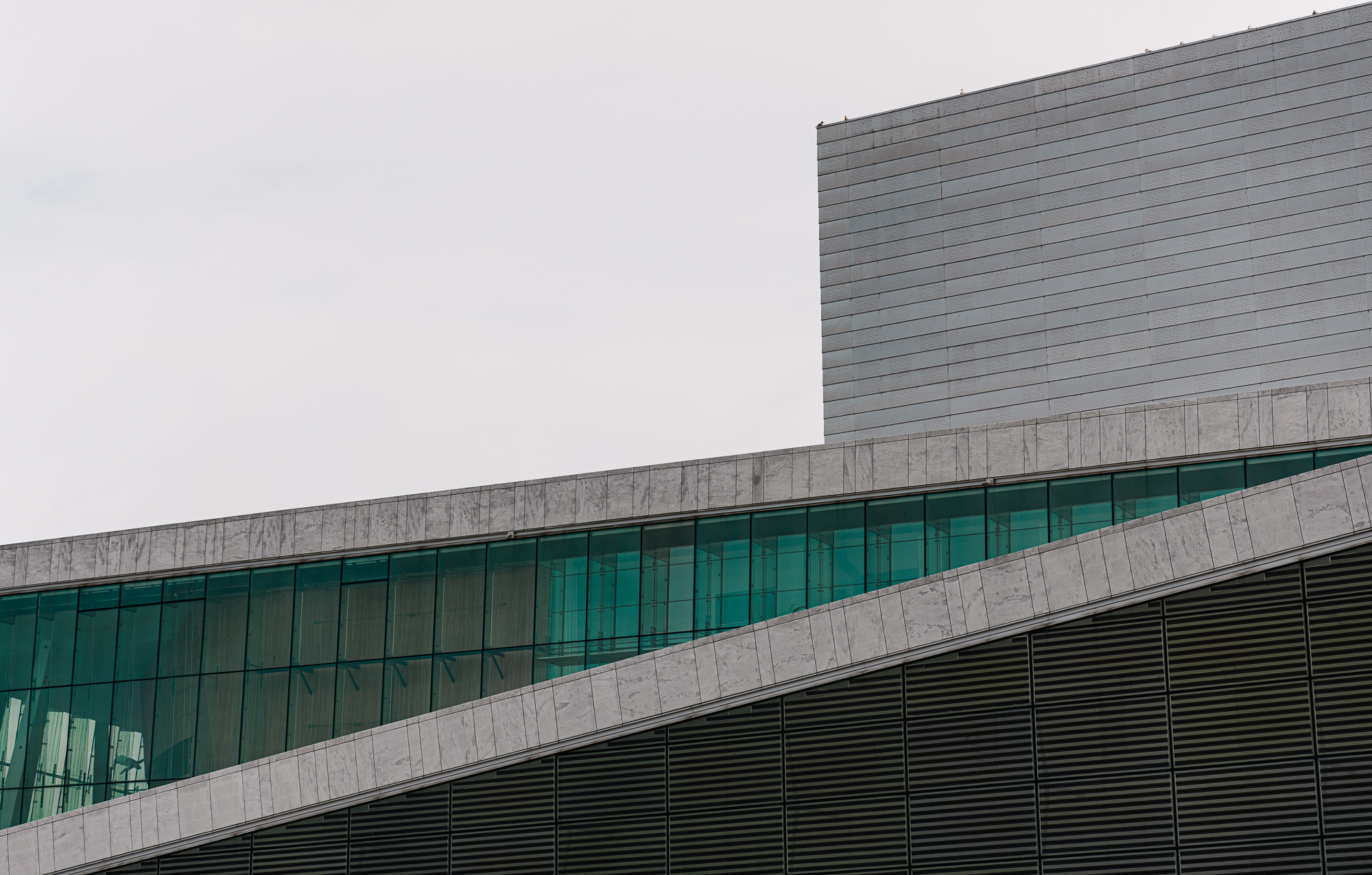 Slate StripesHorizontal stone-clad courtyard with bike racks outside Oslo’s National Museum. Library OverhangCantilevered glass facade of the Deichman Bjørvika Library viewed from below in Oslo. Stark GeometryAngled dark brick facade meets an overcast sky in Oslo. Glass RibbonSloping marble roofline and green-tinted glass of the Oslo Opera House. Cabins AloftClose-up of Ferris-wheel cabins against a pale sky on the Oslo waterfront. Modern MonolithTilted ribbed-glass tower of the MUNCH Museum rising over Oslo. Contrast FormsBronze sculpture "The Mother" by Tracey Emin kneels before the leaning tower of the MUNCH Museum in Oslo. Seagull WatchSeagull on a wooden crate with Nordic cruise ship docked in Oslo harbor. Fjord VistaWide summer view across Oslofjord from a green shoreline in Oslo. Fjord CottagesPine branch frames cottages across Oslofjord from a hillside viewpoint in Oslo. Quiet ContemplationBack-lit bronze sculpture "The Mother" by Tracey Emin kneeling outside the MUNCH Museum in Oslo. Silent HullSepia-toned remains of a wooden boat lie stranded on a calm Oslo inlet. KøbenhavnStockholm