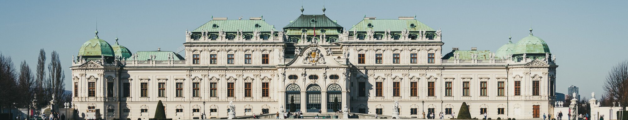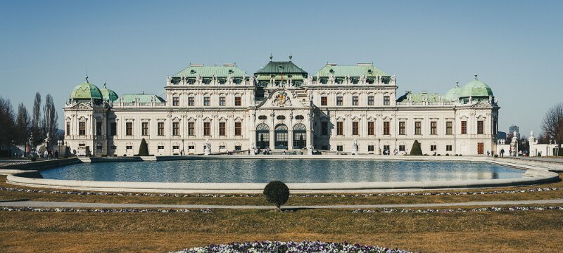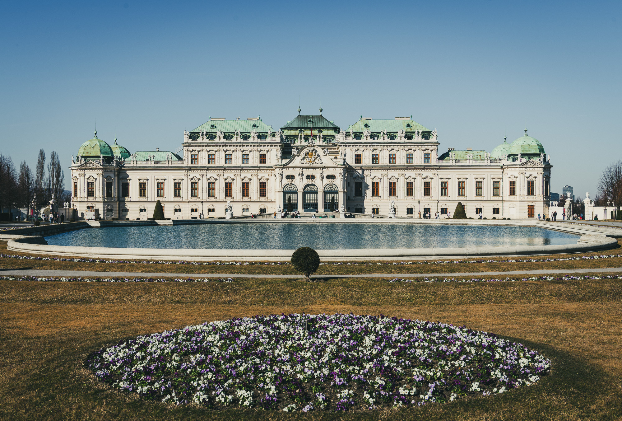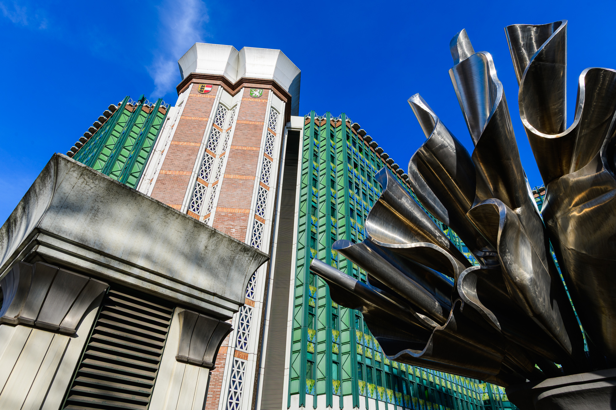 Oblique view of a modernist Vienna building with green panels and a stainless-steel flower-like sculpture against a clear blue sky.