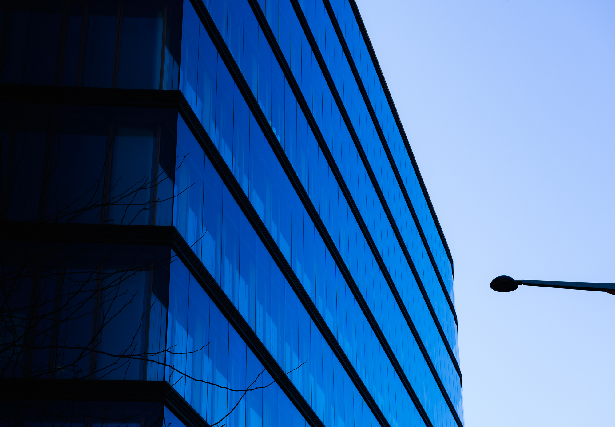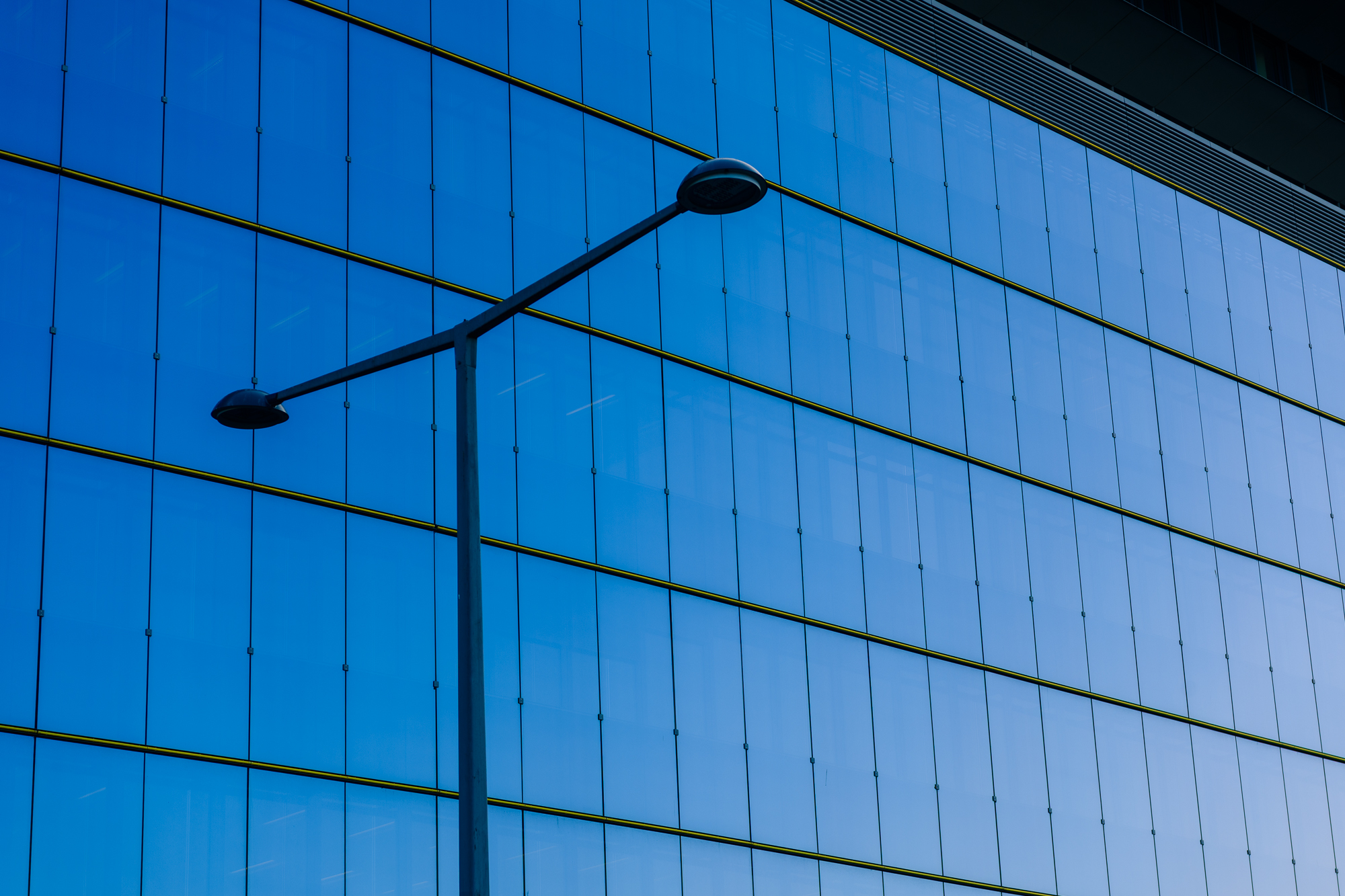 Slim streetlamp silhouette set before a seamless blue glass curtain wall of a contemporary Vienna office block.