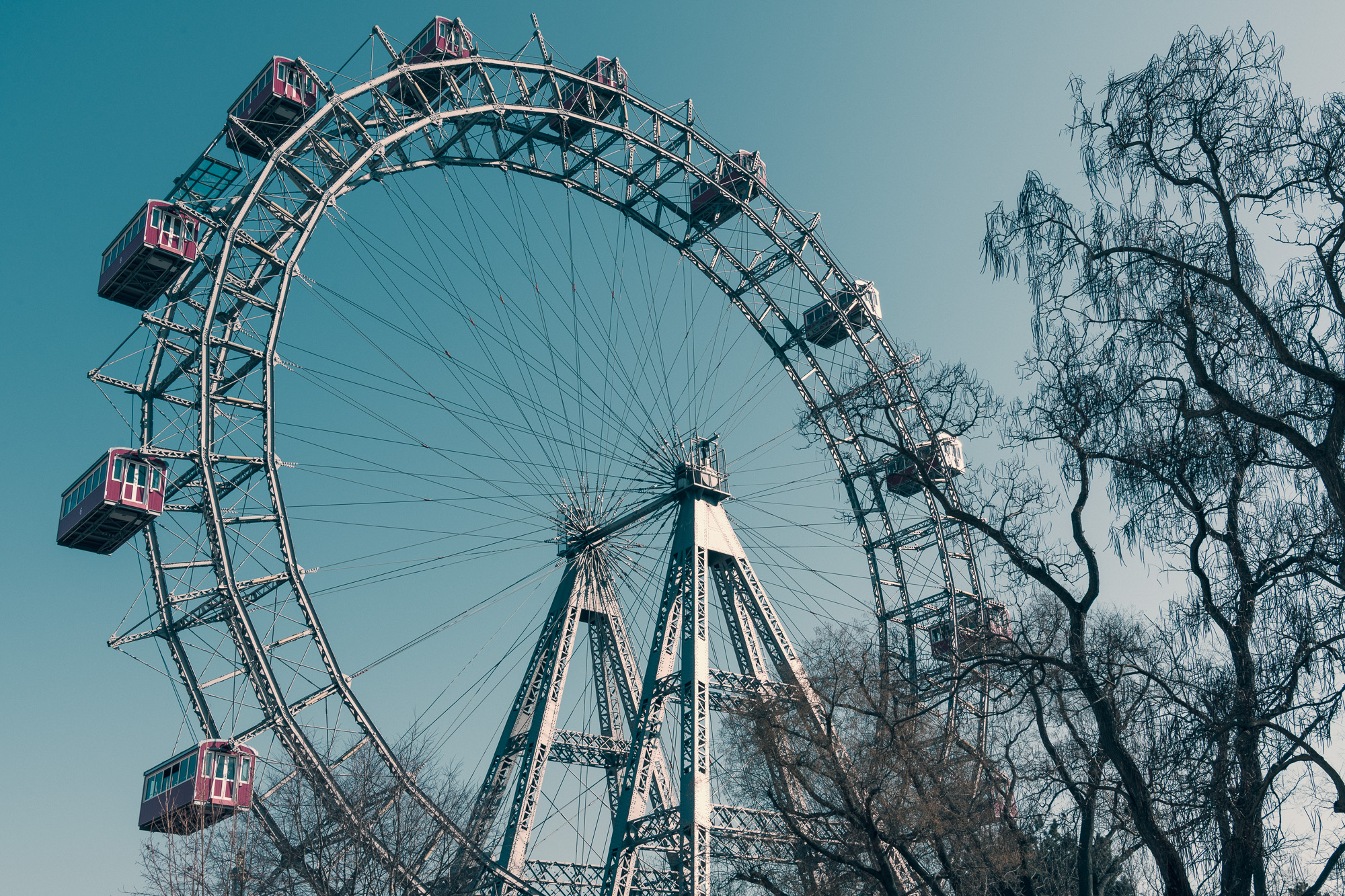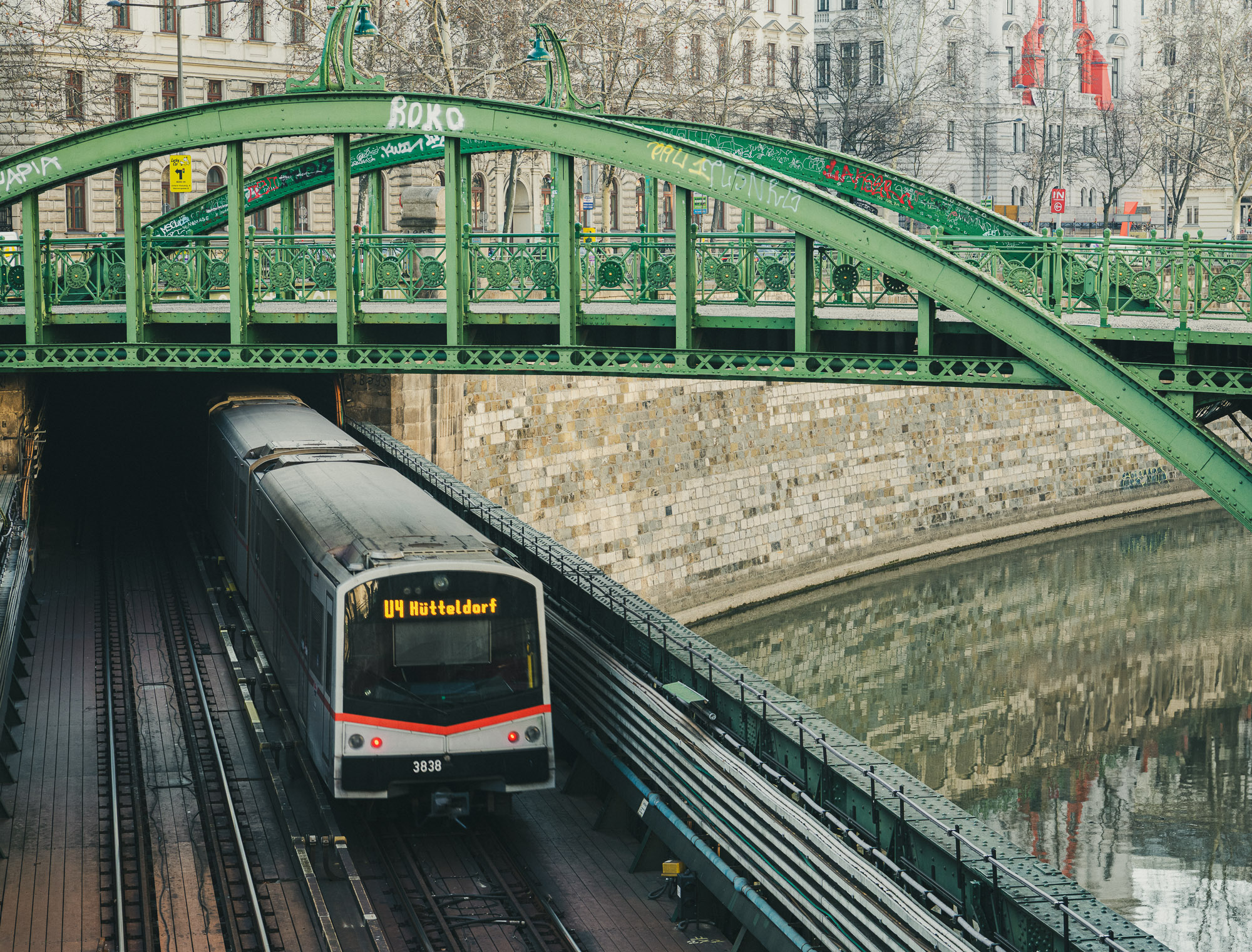 Vienna U4 metro train emerging from a tunnel beneath an ornate green iron bridge along the Wien River.