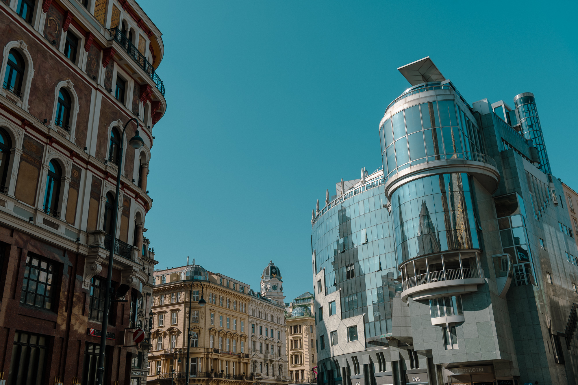 Glass-clad Haas Haus and neighbouring historic façades meet under a clear sky at a central Vienna intersection.